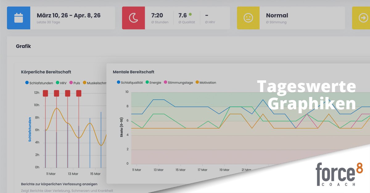Im Tageswerte-Modul behältst Du stets den Überblick über das körperliche und mentale Wohlbefinden Deiner Athlet:innen. Neu werden körperliche Bereitschaft (Schlafstunden, HRV, Ruhepuls, Muskelschmerzen), körperliche Verfassung (Verletzungen, Schmerzen, Krankheiten) sowie mentale Bereitschaft (Schlafqualität, Energie, Stimmungslage, Motivation) in aussagekräftigen Grafiken dargestellt.