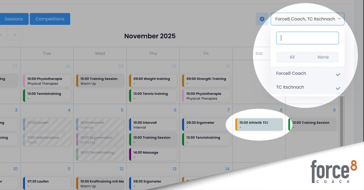 VISION DE LA PLANIFICATION : les données d’entraînement de tes athlètes d’autres organisations peuvent désormais être affichées directement dans Force8 Coach – pour toutes les organisations et en temps réel. Cela facilite considérablement la coordination, par exemple lorsqu’une association nationale souhaite coordonner les rendez-vous des athlètes avec les associations cantonales affiliées ou lorsque plusieurs clubs encadrent ensemble des athlètes.